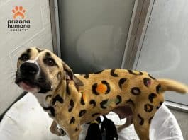 Investigator finds starving dog tied in hot sun — covered in leopard spots